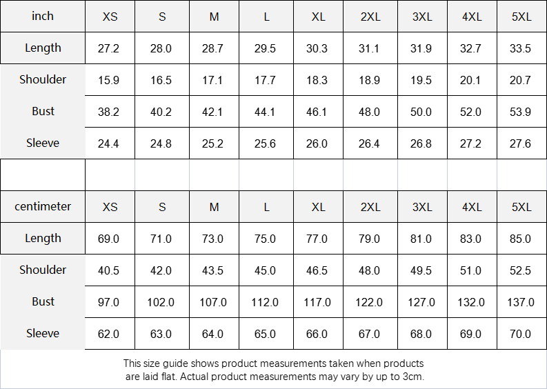 | centimeter | XS | S | M | L | XL | 2XL | 3XL | 4XL | 5XL |